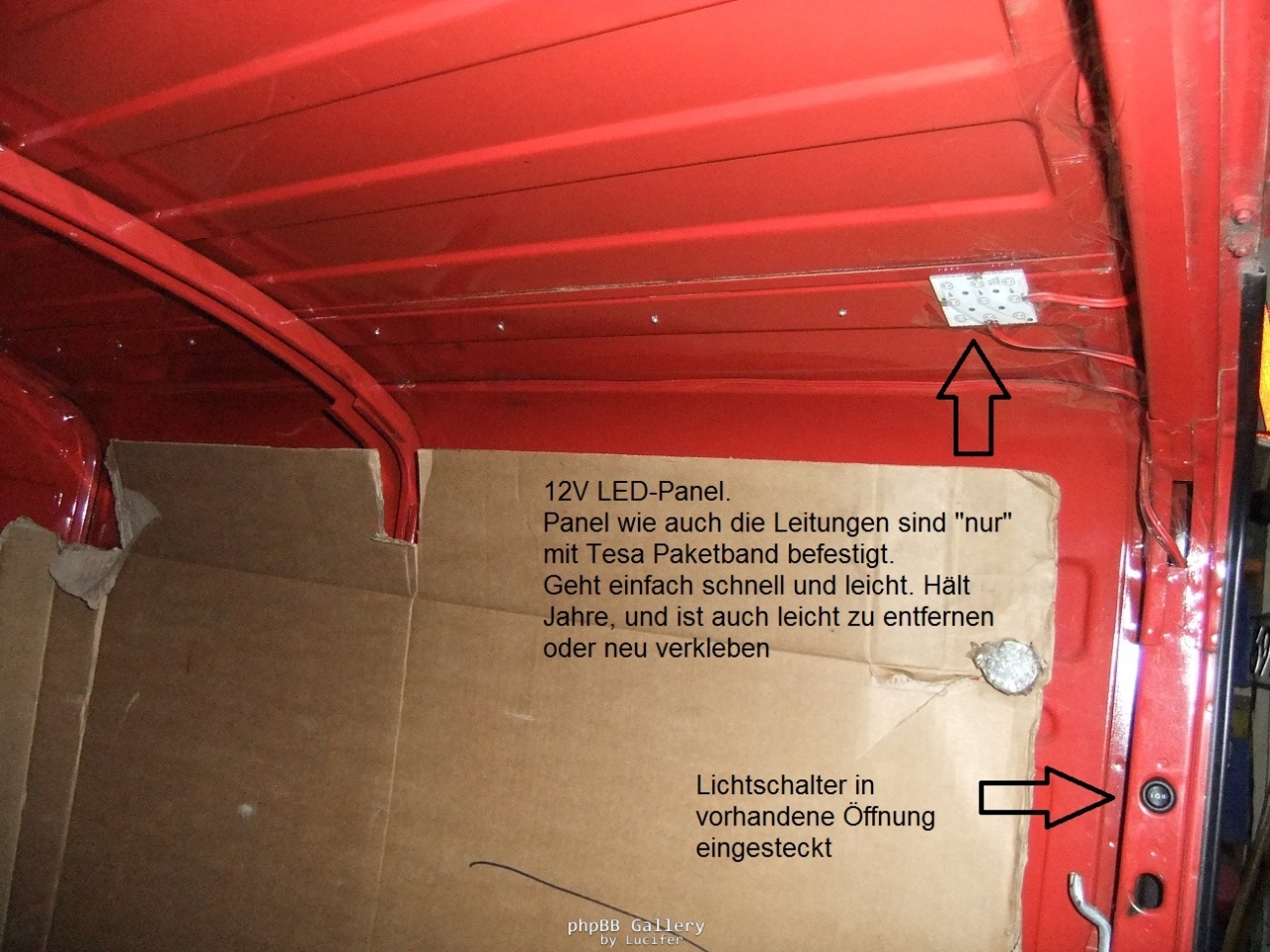 Beleuchtung im Kasten. Links und rechts oben je eine LED-Leuchte